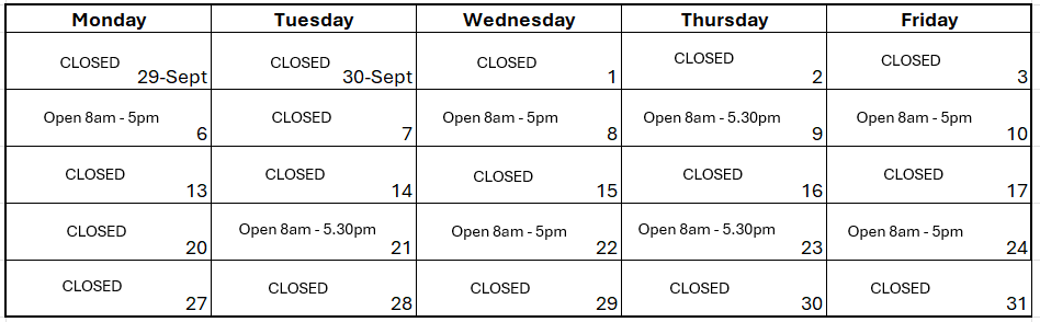Monday / Wednesday / Friday 8.00 a.m to 5.00 p.m. Tuesday to Thursday 8.00 a.m to 5.30 p.m. |